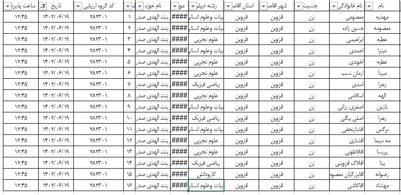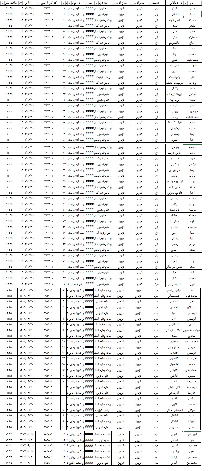 با سلام و احترام داوطلبین لیست ذیل می بایست راس ساعت اعلام شده به مرکز مصاحبه به آدرس قزوین خیابان نواب شمالی پایین تر از میدان شهید حسن پور دانشگاه فرهنگیان قزوین مراجعه نمایند. داوطلبانی که قصد انصراف دارند حتما به یک روز قبل به شماره 028.33339773 اطلاع دهند تا جزو مردودین قرار نگیرند . همراه داشتن 6 قطعه عکس - اصل شناسنامه و کارت ملی - مدرک دیپلم و یا گواهی موقت - کارنامه قبولی کنکور الزامی است زمان و مکان انجام مصاحبه پزشکی پس از پذیرش به داوطلب اعلام خواهد شد. این لیست شامل مراجعین روزهای یک شنبه و دوشنبه می باشد سایر روزها به ترتیب یک روز زودتر اعلام می گردد