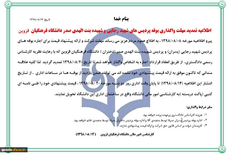 اطلاعیه تمدید مهلت واگذاری بوفه پردیس های شهید رجایی و شهیده بنت الهدی صدر دانشگاه فرهنگیان قزوین 2