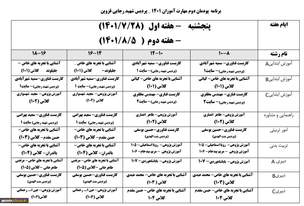 برنامه اجرای کلاسهای پودمان دوم- سری ششم ( هفته اول